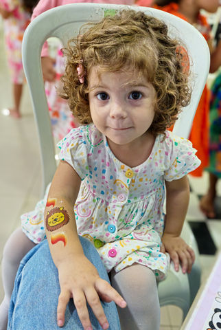 Nossa artista, tia Bi, faz qualquer desenho que você preferir, você pode virar um herói, um dinossauro e até se maquiar, se não tiver dado tempo em casa. Ela arrasa! 'o'